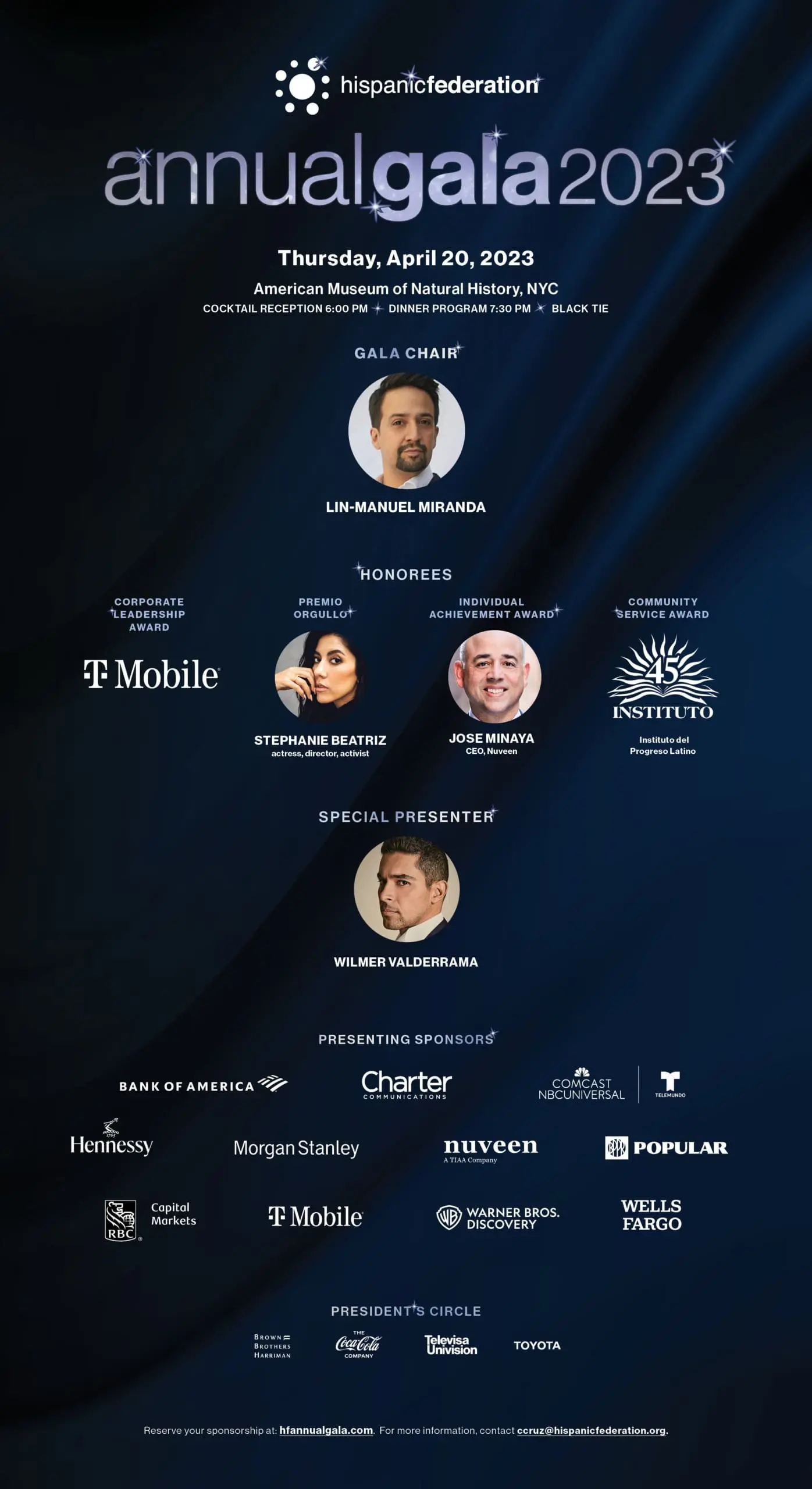 The Federation’s 2023 gala was chaired by award-winning songwriter, actor, director and producer Lin-Manuel Miranda with a special presentation from actor Wilmer Valderrama. The gala paid tribute to extraordinary individuals and institutions committed to inspiring and uplifting the Latino community, including Premio Orgullo (Pride Award) recipient, actress, director and activist Stephanie Beatriz; Corporate Leadership Awardee, T-Mobile; Individual Achievement Award recipient, Nuveen CEO Jose Minaya; and our Community Service Awardee, Instituto del Progreso Latino.